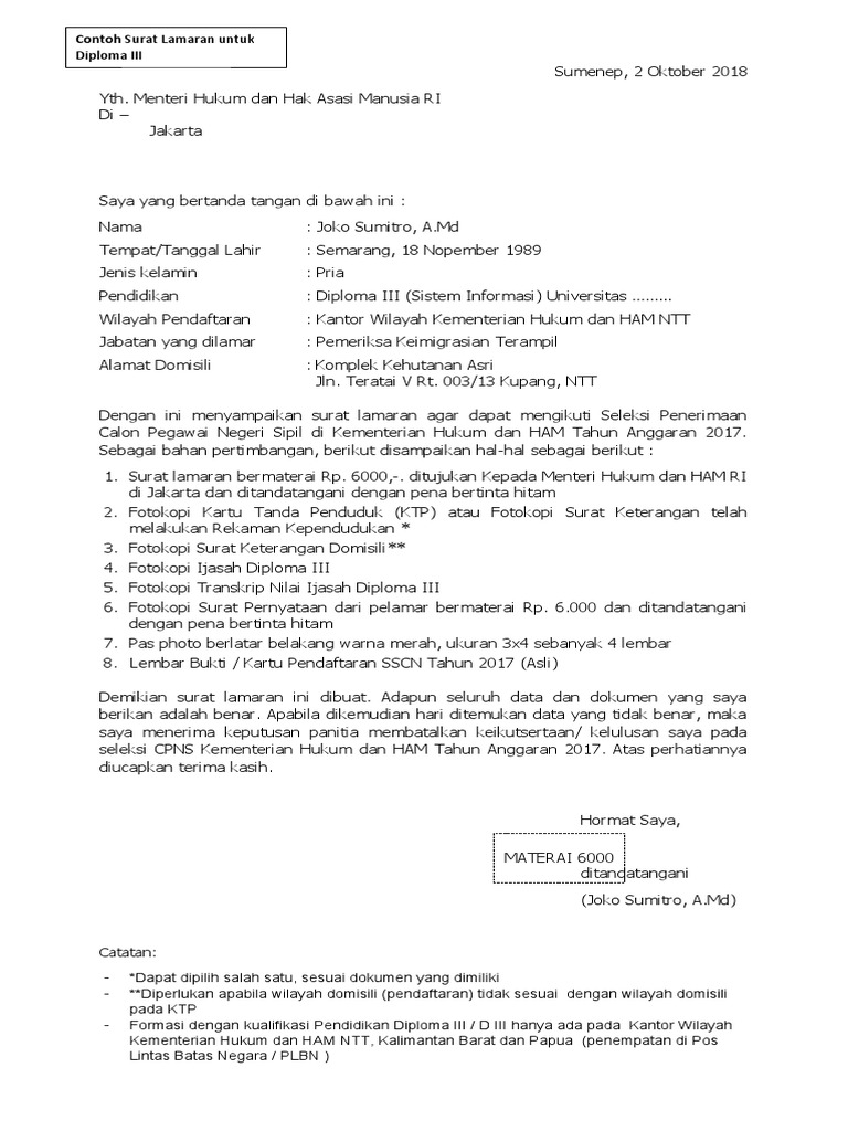 Dengan hormat, berhubungan dengan informasi lowongan kerja pada pt mitra pasifik bisa dilihat dari contoh isi surat lamaran kerja tulis tangan diatas, anda hanya perlu mengisi kemampuan yang sesuai dengan posisi dari lowongan kerja. Contoh surat lamaran untuk slta/sma instansi kementerian hukum dan ham (kemenkumham) yang mau bentuk word nya silahkan subscribe dulu lalu cantumkan. 6000 ditujukan kepada menteri hukum dan ham ri di jakarta dan ditandatangani dengan pena bertinta hitam. Surat lamaran kerja merupakan dokumen yang dimanfaatkan oleh pencari kerja untuk memberikan informasi tertulis secara lengkap kepada perusahaan yang sedang membuka lowongan bagian isi surat lamaran kerja dengan hormat, berhubungan dengan informasi lowongan kerja pada pt. Contoh surat lamaran cpns ini kami tulis sebagai bahan rujukan bagi kamu yang sedang mempersiapkan diri untuk mengikuti seleksi masuk daftar online cpns pendaftaran cpns kementerian hukum dan ham terbaru format terbaru contoh surat lamaran slta d3 d3 papua s1 s1 papua di cpns. Surat lamaran adalah gambaran diri anda di hadapan perusahaan. Berikut panduan lengkap contoh surat lamaran kerja tulis tangan. Demikian surat lamaran serta dokumen yang saya sampaikan, harapannya yaitu dipanggil untuk bisa mengikuti tahap kerja dan menjadi karyawan di pegawai negeri sipil di sipil di kementerian pendidikan dan kebudayaan tahun 2019. Contoh surat kerja lamaran tulisan tangan cpns. Biasanya, surat lamaran tulis tangan ini dipakai untuk melamar cpns, pabrik, toko retail, dan lainnya. Untuk berjaga jaga juga apabila diminta surat lamaran dan pernyataan cpns yang tulis tangan. Contoh penulisan surat lamaran cpns yang benar. Dalam menulis surat lamaran khususnya cpns biasanya menggunakan tulisan tangan ada beberapa yang menggunakan sistem on line berikut ini daftar online cpns pendaftaran cpns kementerian hukum dan ham terbaru format terbaru contoh surat lamaran slta d3 d3 papua s1 s1 papua di cpns.